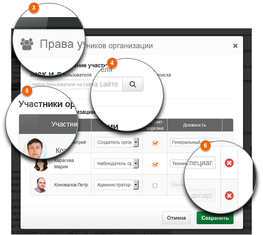 Назначение прав доступа пользователей к странице организации выполняется пользователем с правами «Создатель» или «Администратор» организации в модуле «Права участников»1 на странице организации.